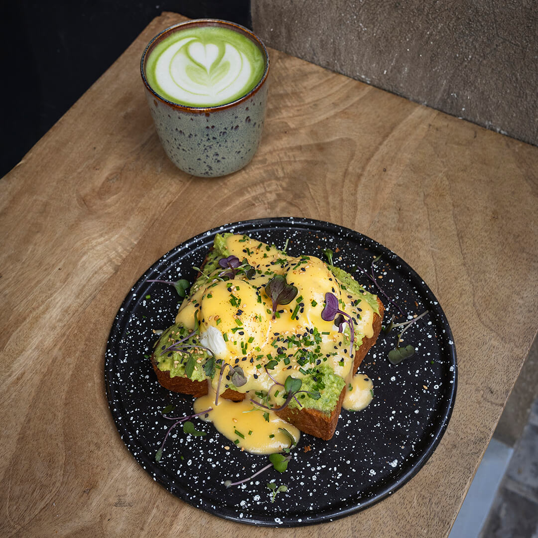 pan brioche artesano, guacamole, huevos escalfados, salsa holandesa
