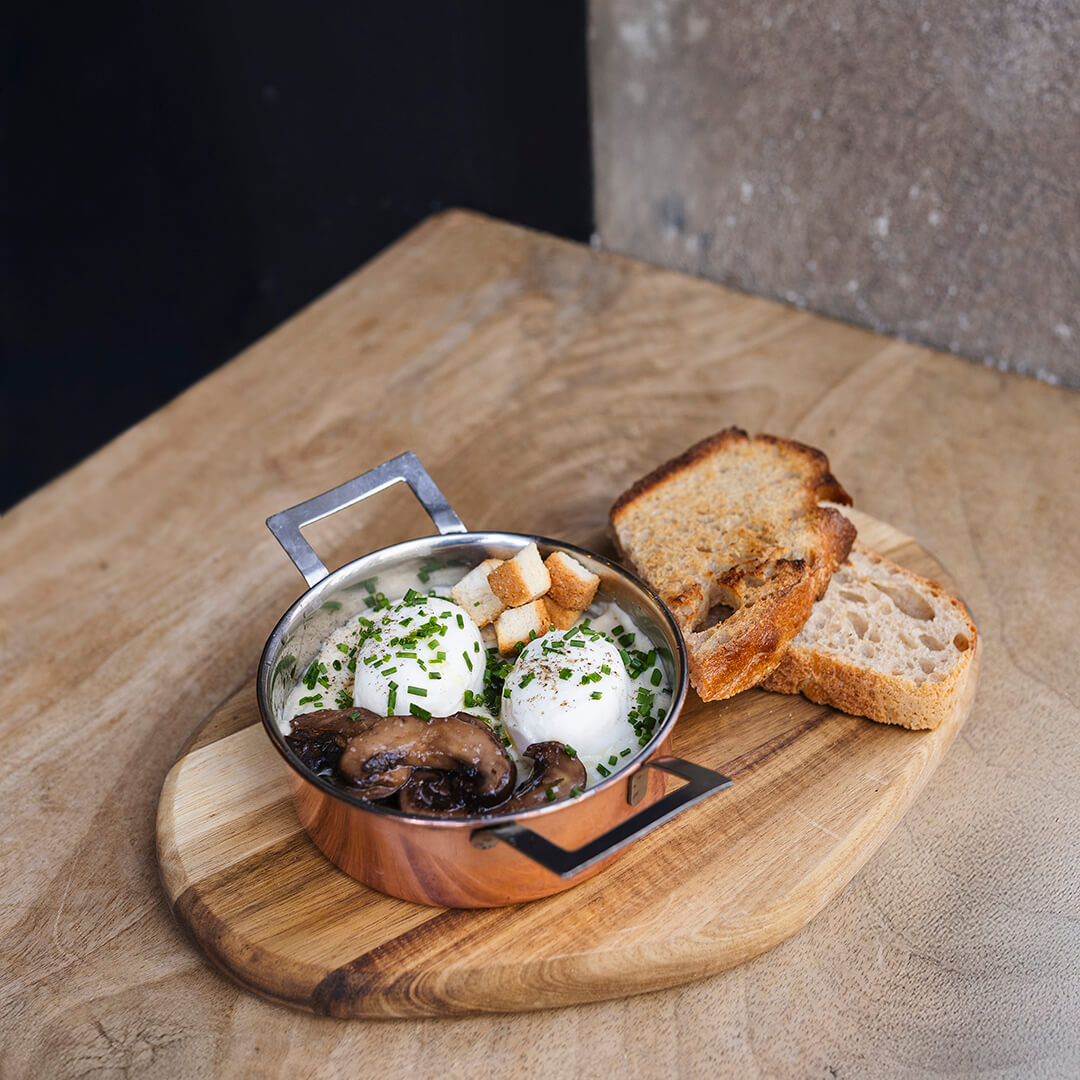 huevos escalfados, salsa trufada, setas al romero, croutons, pan de masa madre