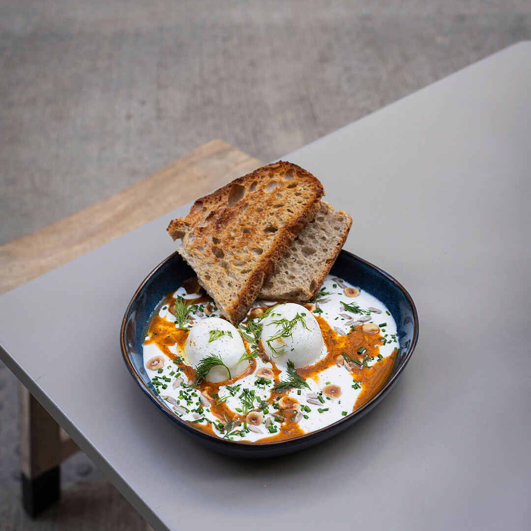 huevos escalfados, yogur especiado, pimentón ahumado, comino, dukkah de avellanas y nuez, pan de masa madre